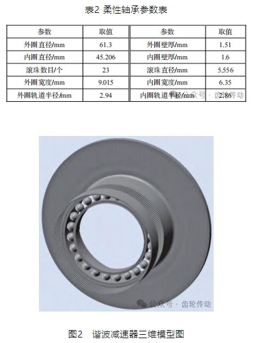 柔性軸承作為波發(fā)生器中最主要的組成部分,它與普通軸承有顯著的區(qū)別,柔性軸承的內(nèi)外圈壁厚很小且具有柔性,因此在與凸輪裝配后可以隨著凸輪輪廓曲線產(chǎn)生強(qiáng)制彈性變形。根據(jù)靜力學(xué)分析,滾子在周向的位移主要受保持架約束,各個滾子之間周向間距基本不變,所以在進(jìn)行有限元分析時將波發(fā)生器簡化為不含保持架的柔性軸承和凸輪兩部分。軸承外圈外徑應(yīng)和柔輪變形前的內(nèi)徑相等,柔性軸承的參數(shù)見表 2。在三維建模軟件 SOLIDWORKS 中,以凸輪軸向?yàn)閆軸、短軸為X軸、長軸為Y軸完成減速器三維模型的裝配,如圖2所示。
