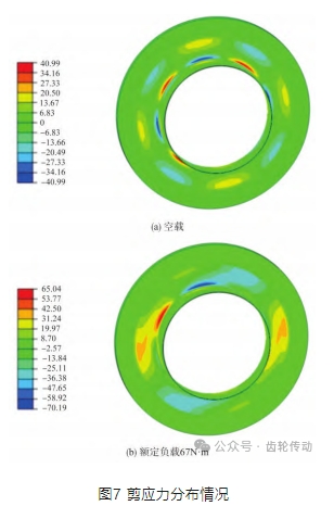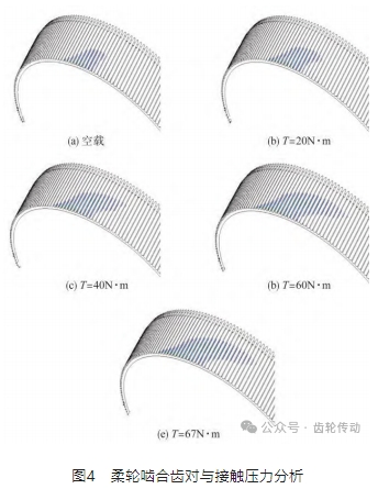 (1)當(dāng)負(fù)載從 20N·m 增至 67N·m 時,柔輪與剛輪的最大接觸壓力只增加了約14%,嚙合齒對數(shù)增加了約68%,表明柔輪可以在負(fù)載變化下通過有效的周向的彈性變形實(shí)現(xiàn)載荷在齒對間的重新分配,負(fù)載的變化并不會顯著引起嚙合齒對的接觸壓力的變化。