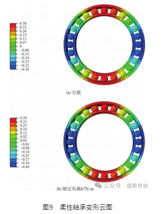 為了進(jìn)一步探究造成柔輪應(yīng)力分布及變形規(guī)律的原因,對同樣具有柔性的薄壁軸承進(jìn)行分析顯得十分必要。圖9為柔性軸承在空載和受載時的徑向變形云圖,從圖9中可知,柔性軸承被剛性凸輪撐開后,其長軸和短軸的最大徑向變形為0.38mm,已知理論的徑向變形量為0.3805mm,與有限元分析結(jié)果基本一致;在鋼輪上施加額定負(fù)載67N·m 后,柔性軸承的長、短軸變形略有變化。