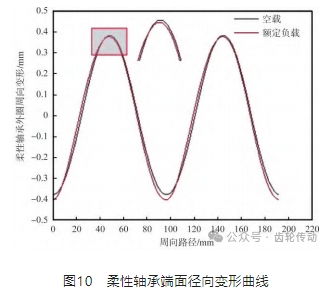 加載后柔性軸承外圈的徑向變形量變化較內(nèi)圈變化明顯,圖10詳細(xì)給出了空載和加載狀態(tài)下沿著軸承圓周方向其外圈外端面的徑向變形情況,加載后外圈長軸的徑向變形減小,而短軸增大,這是因?yàn)榧虞d后長軸端受到了柔輪上嚙合齒的載荷作用而壓縮長軸,軸承沿著扭矩方向轉(zhuǎn)動,導(dǎo)致短軸的徑向變形增大。