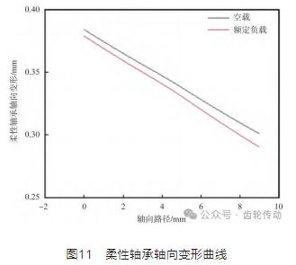 分析了外端面周向的徑向變形后,進(jìn)一步分析軸承外圈長軸位置處沿著軸線方向的徑向變形量,如圖11所示,其中橫坐標(biāo)表示分析位置到軸承外端面的距離,與圖10對應(yīng)處的受載荷軸承長軸位置的徑向變形沿著軸線都變小,且在內(nèi)端面位置達(dá)到最小徑向變形。