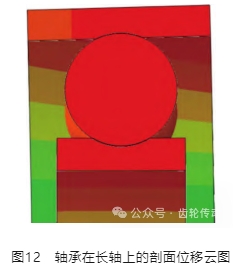 為了進(jìn)一步分析軸承在軸向的徑向變形特征,圖12給出了軸承在長軸上的剖面變形云圖。從圖12中可知,實(shí)際情況下的柔性軸承變形遠(yuǎn)比等效凸輪復(fù)雜。實(shí)際上,由于柔性軸承內(nèi)圈表面與凸輪表面屬于過盈配合,其徑向位移受到凸輪限制,軸向徑向變形基本一致;而軸承外圈沿著軸向卻有非常明顯的傾斜,導(dǎo)致軸承外圈呈現(xiàn)出喇叭口的變形,主要是因?yàn)檩S承外圈在安裝過程中是由柔性軸承和滾子約束其徑向位移的,所以在柔性軸承裝入柔輪并發(fā)生橢圓變形后,外圈與柔輪內(nèi)壁的接觸是從軸承內(nèi)端面至外端面,導(dǎo)致軸向并不是都與柔輪內(nèi)壁發(fā)生了接觸,這也是柔輪徑向變形量沿著軸向呈現(xiàn)出非線性的主要原因。