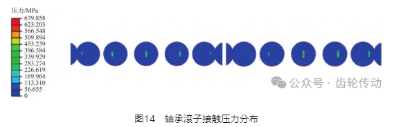 圖 14 給出了軸承空載和加載下滾子與外圈接觸時滾子的接觸壓力分布情況。從圖中可知,滾子上接觸壓力呈現(xiàn)細(xì)長橢圓形,加載前與外圈接觸的滾子位置具有最大接觸應(yīng)力為529.1MPa,而加載后該位置的接觸壓力上升到679.9MPa,且滾子壓力分布也與滾道類似,沿著長軸一側(cè)偏移。