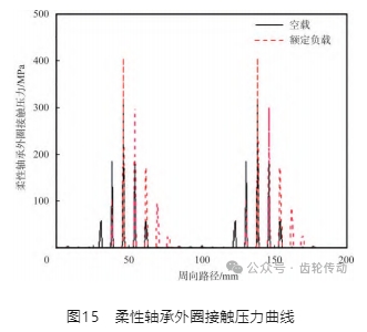 柔性軸承的復(fù)雜徑向變形除影響柔輪齒廓設(shè)計外,軸承內(nèi)部的接觸壓力分布也會對軸承的壽命產(chǎn)生重要影響。圖 13 為軸承外圈在空載和負(fù)載情況下的應(yīng)力分布云圖。從圖13中可知,在空載狀態(tài)下軸承外圈長軸端接觸滾子總數(shù)為5個,且滾子在長軸兩側(cè)對稱分布,滾子與滾道沿著長軸方向呈細(xì)長橢圓形接觸;空載下外圈滾道上最大接觸壓力為 318.3MPa,而加載后外圈滾道最大壓力上升到了 419.45MPa,滾道上的接觸壓力分布規(guī)律顯著發(fā)生變形,其壓力分布不再對稱,而是向長軸的一側(cè)偏移。