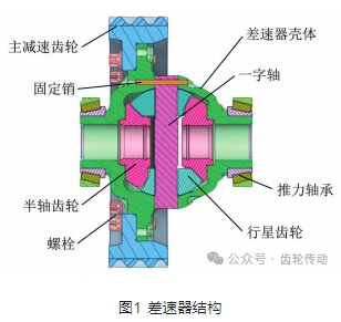 本文分析的差速器結構如圖1 所示,主要由主減速齒輪、差速器殼體、一字軸、行星齒輪、半軸齒輪等組成,其中,主減速齒輪與差速器殼體采用螺栓連接。