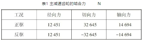 以直線行駛工況下正反驅最大扭矩工況作為求解差速器殼體應力水平的仿真工況,通過MASTA軟件計算得到主減速齒輪的嚙合力,見表1。