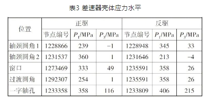 在正反驅最大扭矩工況下,差速器旋轉一周時,差速器殼體軸頸圓角、窗口、過渡圓角和一字軸孔部位的應力水平見表3,P1為最大主應力,P3為最小主應力,各部位最大主應力均未超出材料的強度極限,滿足靜強度要求。
