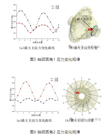 差速器殼體各部位最大主應力的變化規律如圖5~9所示,最大主應力大小基本均呈180°周期性變化,但相位變化各不相同。圖5中軸頸圓角1處最大主應力位置不隨加載位置變化而變化;圖6中軸頸圓角2處最大主應力位置隨加載位置不同呈圓周分布;圖7 中窗口處最大主應力位置只可能出現在4個位置處;圖8中過渡圓角處最大主應力出現在過渡圓角與一字軸孔交接處;圖9 中一字軸孔處最大主應力位置隨著加載位置變化而在兩個孔之間交替變化。