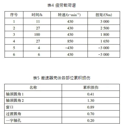 累積損傷計算:為了有效評估差速器殼體的疲勞壽命,按照QC/T 1022—2015規定,制定出6 級疲勞載荷譜,見表4。表3 中正驅工況應力水平對應表4 中第1 級載荷,反驅工況應力水平對應第5、6 級載荷,其他級載荷對應的應力水平通過與第1 級載荷的扭矩比進行線性換算得到。由式(5)、(6) 計算得到軸承圓角2 在第1 級載荷下的應力幅Sa為179.5 MPa,平均應力Sm為180.5 MPa,則由式(4) 計算得修正應力幅Se為256 MPa,結合S-N曲線,計算得到第1 級載荷產生的損傷為1.11,第 2 級載荷產生的損傷為0.19,第3~6 級載荷產生的損傷均為 0,由式(3)計算得累積損傷D為1.30,大于1,存在疲勞失效風險,失效起始位置為軸頸圓角 2 最大主應力處。依據相同的方法計算得到其他部位的累積損傷均小于1,不會發生疲勞破壞,各部位的累積損傷見表5。由表 3 和表 5 可知,一字軸孔的最大主應力最大,但其應力幅最小,計算得到的累積損傷最小,說明應力幅是決定差速器殼體疲勞壽命的主要因素。