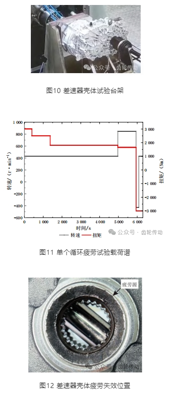 隨著電動汽車逐漸普及,電驅動總成的可靠性越來越被重視,差速器是電驅動系統的重要傳動部件,其疲勞可靠性是重點考核點。差速器結構復雜,運行環境惡劣,存在多種失效形式,較難全面充分地評估其可靠性,一些學者對差速器錐齒輪的強度及失效形式進行了研究。文獻通過將行星輪圓柱銷與行星輪的連接關系簡化為滑動軸承連接形式,進行圓柱銷失效過程分析。文獻對差速器殼體過渡圓角處的失效行為進行分析。鄒喜紅等基于實測載荷譜和臺架試驗對差速器殼體窗口和圓柱銷孔部位的疲勞失效進行研究。純電動汽車相比傳統燃油車速比更大,則連接主減速齒輪和半軸的差速器殼體承受著更嚴酷載荷,更易發生失效。