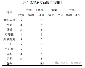 1)對標應用:評估行業(yè)內(nèi)標桿的、成熟的應用;2)性能:評估傳動系統(tǒng)的階次偏離度、重合度、軸系撓度、嚙合錯位、傳遞誤差、效率等;3)重量:評估整個方案的重量差異,應包含關聯(lián)部件的重量;4)可靠性:評估安全系數(shù)、軸承損傷率、最大應力等;5)關聯(lián)變更:評估更改可能引起其他零件的性能、強度、接口和空間的匹配;6)工藝:評估零件加工生產(chǎn)工藝的可行性和裝配工藝的可行性;7)平臺化:評估當前設計方案的通用性;8)成本:評估方案的總體成本,包括零件自身變化帶來的成本變更,以及關聯(lián)變更帶來的成本變更,裝配工藝的成本變更,可能產(chǎn)生的修模費用和報廢費用;9)周期:評估方案的生產(chǎn)制造周期,驗證周期是否能夠滿足項目要求。具體決策矩陣如表 1 所示。