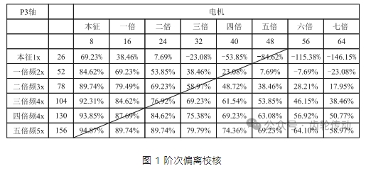 擁有多級傳動的變速器中,下一級傳動的齒數(shù)比也尤為重要。除了每級的傳動產(chǎn)生的嚙合階次,還需要注意避開電機的槽、極階次。一階及其倍數(shù)階次需要與不同部件的一階及其倍數(shù)階次存在階次偏離度(>7%或更高),避免階次相同的振動源在嚙合時產(chǎn)生相同的頻率,引起共振問題。如圖 1 所示,某變速器中與電機直連的 P3 軸齒輪,其齒數(shù)為 26 齒,其主階次為 26 階,需要關注其與電機 8 階及其倍階的校核,按當前經(jīng)驗需要在 5 倍階次內(nèi)都滿足>7%的偏離要求,超過 5 倍階后,由于能量下降可不再重點關注。