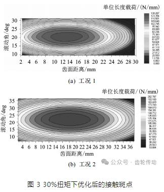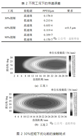 通過設定多種梯度相同的正向扭矩工況模擬車輛前進,設定負扭矩的工況模擬拖曳、能量回收和倒車,可以得到如表 2 所示的不同工況下的傳遞誤差峰峰值(Peak to Peak Transmission Error, PPTE),及如圖 2 和圖 3 所示的接觸斑點。