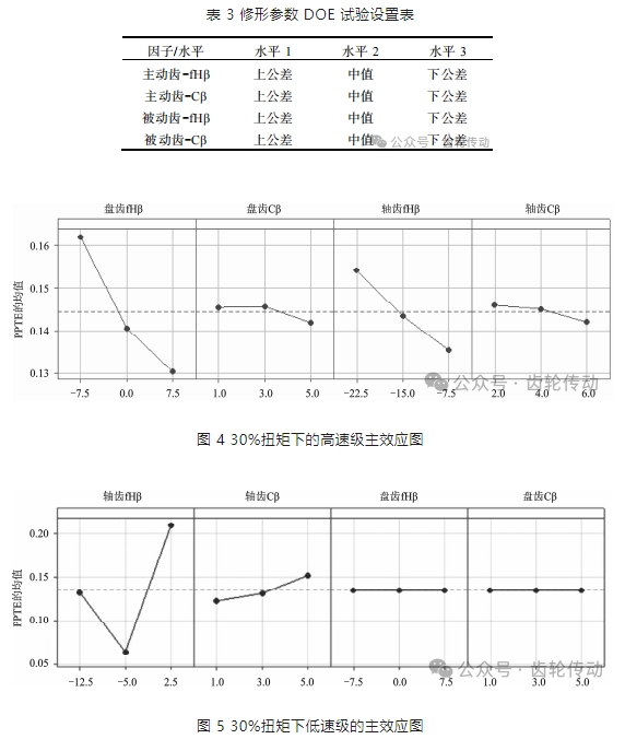 借助試驗設計(Design Of Experiment, DOE)的方法,以齒輪修形參數(shù)為因子,以公差偏差及中值為水平,以傳遞誤差為響應值,進行修形參數(shù)的全因子設計如表 3 所示,并通過效應分析,可以得到每種修形在不同工況下的效應圖,如圖 4 和圖 5 所示。可以看出圖 4 中,高速級對修形參數(shù)的變化比較敏感,圖 5 中低速級對修形參數(shù)的變化相對不敏感。通過這種方法,可以確認設計值的中值以及公差帶范圍,并且針對將來可能出現(xiàn)不同扭矩下的階次噪音問題,已經(jīng)獲得了零件的修形傾向,極大地增強了設計的魯棒性。