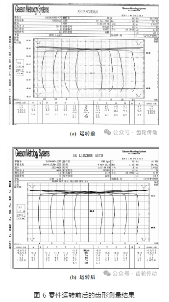 通過耐久試驗后,使用齒輪測量機對齒輪進行檢測,觀察齒形齒向上的嚙合情況,測量結果如圖 6 所示。可看出未出現(xiàn)由于偏載帶來的嚙合凹陷,齒面接觸狀態(tài)良好,齒面狀態(tài)與新件接近。