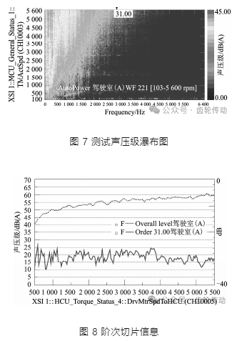 通過階次噪音測試,獲得測試的瀑布圖如圖 7 所示,切片信息如圖 8 所示。臺架及整車上均未發(fā)現(xiàn)明顯的齒輪階次線,且階次的切片低于總聲壓級 30 dB 值左右,表現(xiàn)良好。