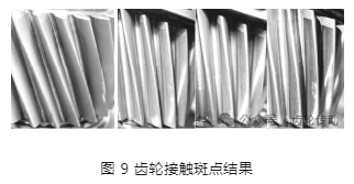 對已有的齒輪,按仿真的載荷開展嚙合斑點試驗,并與仿真的接觸形狀比對,所獲得的斑點如圖 9 所示。未觀察到有偏載現(xiàn)象,與仿真結果基本一致。
