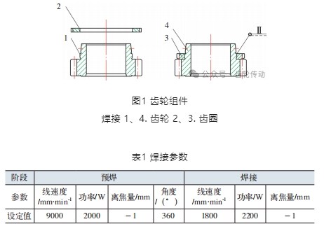 某主動(dòng)齒輪母體材料為 20MnCr5 ,配對(duì)齒圈材料為 16MnCrS5 ,材料成分符合 EN10084標(biāo)準(zhǔn)要求。主動(dòng)齒輪主要工藝流程:鍛造成形→等溫正火→精車→齒形加工→超聲波清洗→壓配→焊接;配對(duì)齒圈主要工藝流程:沖壓成形→正火→超聲波清洗→壓配→激光焊接。齒輪和齒圈采用過盈配合,過盈量控制在0.01~0.03mm,經(jīng)激光焊接后成為齒輪組件(見圖1);焊接參數(shù)見表1。