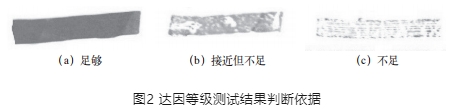 (1)表面清潔度對(duì)焊縫質(zhì)量影響采用表面張力測(cè)試筆(以下簡(jiǎn)稱達(dá)因筆)來檢測(cè)工件表面清潔度。達(dá)因筆能夠分析出不同固體的表面能、親水性、潤(rùn)濕度等微小變化。測(cè)試時(shí),首先選擇一個(gè)中間值測(cè)試筆作起點(diǎn),如果在2s內(nèi)測(cè)試筆潤(rùn)濕基材表面,那么需要選一更大值的測(cè)試筆進(jìn)行第二次測(cè)試,以此類推,直到測(cè)試結(jié)果在2s內(nèi)改縮成水珠狀,則這次測(cè)試之前一次的值就被視為基材的表面能,并以此作標(biāo)準(zhǔn)比較(見圖2),達(dá)因等級(jí)數(shù)值越大,表示清潔度越高。該方法直觀便捷,適合大批量生產(chǎn)過程控制。