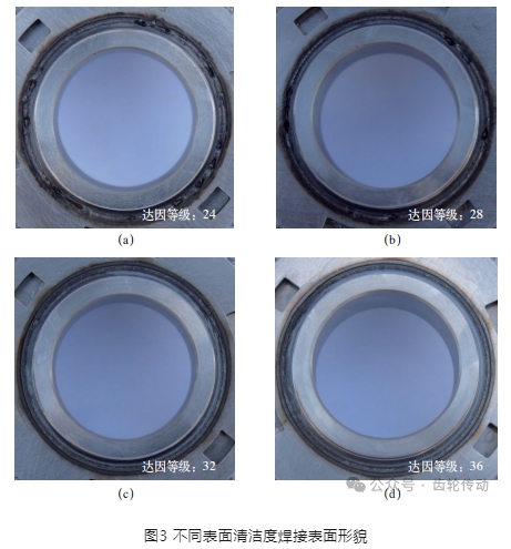 圖3是表面清潔度符合不同達(dá)因等級(jí)得到的工件焊接表面狀態(tài)。清潔度符合達(dá)因等級(jí)≥36 要求的工件焊接后外觀無明顯缺陷,焊道均勻,焊縫表面呈現(xiàn)典型的魚鱗狀;但清潔度僅符合達(dá)因等級(jí)32要求的工件焊后表面有輕微氣孔;清潔度小于達(dá)因等級(jí) 28的工件焊后表面存在大量氣孔,部分氣孔連在一起成為鏈狀氣孔,且焊道有焊瘤。這是因?yàn)楸缓附用娼?jīng)過前面多工序加工,在工件表面殘留有油污、水分或灰塵等污染物,這些污染物在焊接時(shí)會(huì)產(chǎn)生以下不良后果:焊接時(shí)焊道上存在的污染物汽化從熔池中溢出,導(dǎo)致大量的飛濺從而在工件表面留下表面氣孔或焊瘤;二是來不及溢出的水氣或油氣在焊縫內(nèi)部產(chǎn)生大量氣孔。