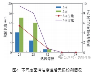 圖4顯示了不同表面清潔度 條件下焊后檢測(cè)趨勢(shì)。最大單缺陷L 單指表示圓周方向長(zhǎng)度最大的缺陷,L 單=L單/(2πR)×100%;累計(jì)缺陷L累指累計(jì)內(nèi)部單缺陷長(zhǎng)度之和,L累=L累/(2πR)×100%;R為焊縫半徑。圖4中檢測(cè)結(jié)果顯示,符合清潔度對(duì)焊接接頭質(zhì)量影響規(guī)律:清潔度越高,缺陷越少,在本試驗(yàn)條件下清潔度符合達(dá)因等級(jí)36號(hào)及以上時(shí),氣孔和飛濺可降為0。結(jié)合圖3和圖4結(jié)果分析,生產(chǎn)過程控制可采用36號(hào)達(dá)因筆來嚴(yán)格控制齒輪組件焊前表面清潔度。