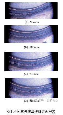 焊縫表面形狀在一定程度上可反映焊接工藝的合理性及焊縫的可靠性。焊縫的表面形態(tài)主要考察焊縫平整性、連續(xù)性、宏觀氣孔與裂紋等方面。圖5顯示了不同保護(hù)氣流量條件下得到的焊接表面狀態(tài),從圖5中可以看到:過小的保護(hù)氣體流量防護(hù)效果不佳,焊縫表面有鏈狀氣孔且焊道煙塵多;氬氣流量為10L/ min時(shí),焊接表面連續(xù)、平整,無宏觀裂紋;保護(hù)氣體流量在 20L/min以上時(shí),焊接出現(xiàn)鏈狀氣孔、焊瘤,焊瘤金屬流向與氬氣吹氣方向相似。