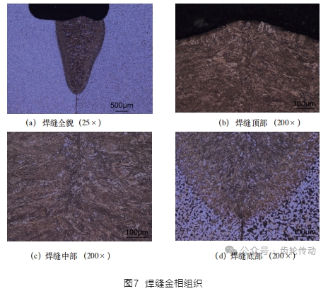另外,顯微硬度的影響主要來自于冷卻速度,在焊接功率和焊接速度不變的情況下,可能過冷度變化微小,組織無明顯差異。圖7為焊縫組織,可以看到熔合區(qū)板條狀馬氏體和少量的殘余奧氏體;熱影響區(qū)組織主要為板條馬氏體和少量鐵素體;基體組織正火態(tài)片狀珠光體和鐵素體。