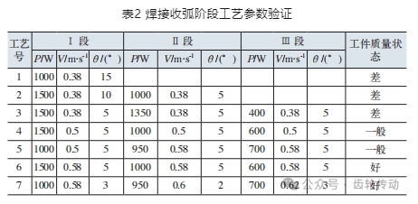 (3)零件整圈焊接完成后,用階梯式降低能量進(jìn)行收弧:焊接速度分三段梯次加快及焊接功率分三段梯次降低。