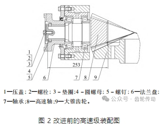 根據(jù)現(xiàn)場實際使用情況,拆下減速器高速級結(jié)構(gòu)的部件進(jìn)行分析研究,電機車減速器第一級圓錐齒輪傳動在減速器高速級,牽引電機通過萬向聯(lián)軸節(jié)與法蘭盤連接,當(dāng)電機高速運轉(zhuǎn)時,第一級圓錐齒輪的小錐齒輪軸(以下簡稱“高速軸”) 高速運轉(zhuǎn),改進(jìn)前的高速級裝配圖見圖 2。