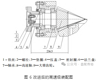 (3) 在組裝完軸承座、軸承等件后,高速軸與大錐齒輪配合齒面接觸率、錐齒輪的側(cè)隙調(diào)整至最佳狀態(tài)( 錐齒輪側(cè)隙為 0.1 ~ 0.3 mm,錐齒齒面接觸率齒長、齒高均大于 65% ) 后,現(xiàn)配調(diào)整墊,再組裝各件,現(xiàn)場確定壓蓋(詳見圖 4) a 尺寸再加工,然后組裝壓蓋,2 個螺栓擰緊后,2 個螺栓頭部穿鐵絲擰緊,2 個螺栓連接成 8 字防松狀態(tài); 法蘭盤端面上開 1 個圓槽,圓槽內(nèi)裝密封圈,解決了減速箱的滲油問題。最后在軸承座端面上涂抹密封膠,壓上軸承蓋,6 個螺栓和墊圈將軸承蓋與上箱體緊固。這樣萬向聯(lián)軸節(jié)就不會與螺栓干涉,再加上 2 個螺栓頭部穿鐵絲擰緊,可以有效利用鐵絲的拉力使螺栓保證一定的拉緊力,不會產(chǎn)生旋動,更不會使高速軸裝配尺寸在高速運轉(zhuǎn)時發(fā)生變化。改進(jìn)后的高速級裝配圖如圖 6 所示。