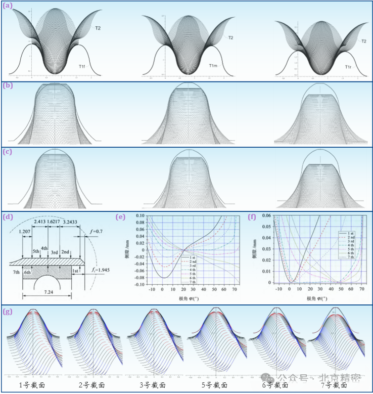 圖7 三維齒形共軛設(shè)計與修形:(a) 線接觸連續(xù)共軛三維齒形設(shè)計; (b)-(c) 點接觸連續(xù)共軛三維齒形設(shè)計; (d-g) 近似共軛的徑向變?yōu)樾扌稳S齒形.