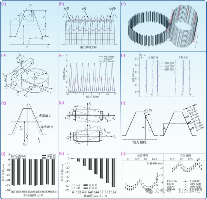 圖8 滾齒加工誤差分析:(a) 滾刀軸向齒形; (b) 滾齒仿真截面示意圖; (c) 加工仿真; (d) 滾刀空間運動關(guān)系; (e) 不同軸向進(jìn)給量下的齒向誤差; (f) 左右側(cè)齒面的齒向誤差; (g) 成型滾刀軸向齒形; (h) 滾刀安裝誤差示意圖; (i) 滾刀切削刃齒形誤差示意圖; (j) 滾刀跳動相位角對齒形誤差的影響; (k) 滾刀跳動值對齒形誤差的影響; (l) 滾刀安裝誤差引起的齒形誤差.