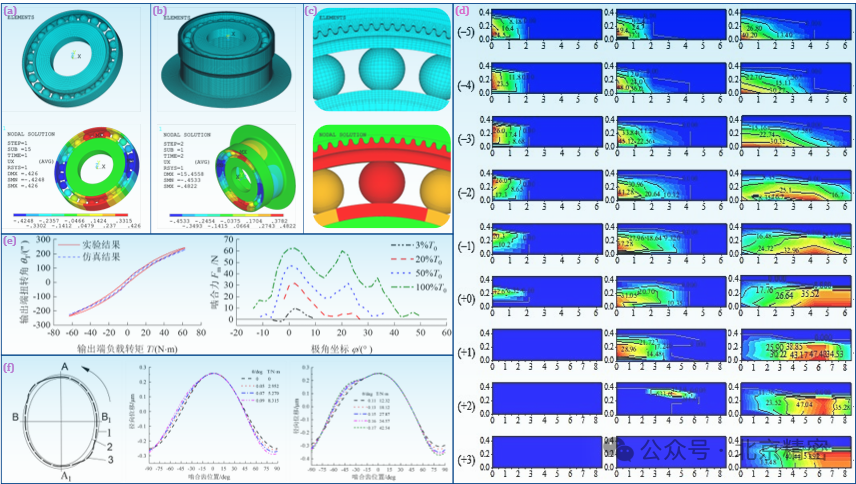 課題組基于諧波減速器的有限元虛擬樣機,固定凸輪時在輸出端施加扭矩載荷,獲得了齒面的接觸比壓(圖11d),揭示了齒面的實際接觸區域,獲得了齒面承擔負載的位置。同時該有限元虛擬樣機模型能夠較為準確的反映諧波齒輪減速器的整機扭轉剛度特性(圖11e)。同時,課題組通過對有限元虛擬樣機施加不同大小的扭矩載荷,觀察了柔輪在負擔不同大小扭矩載荷下的變形。結果顯示,在承擔較小載荷時,嚙入區的間隙基本就已經被消除,嚙出區產生了不顯著的畸變,隨著負載的增大,柔輪的畸變也逐步顯著起來。