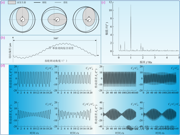 諧波齒輪的多齒共軛嚙合狀態和柔輪的薄壁彈性結構能夠在一定程度上均衡輪齒的制造誤差所帶來的影響。但工程實際中,諧波減速器的傳動誤差依然是一個顯著的問題。為了改善工程實踐中諧波減速器的傳動精度,課題組對其傳動誤差進行了溯源(圖12a、b)和頻譜分析(圖12c),研究了凸輪、柔輪和剛輪的制造及安裝誤差對整機傳動誤差的影響。并基于波形疊加原理,揭示了傳動誤差中紡錘、波浪等宏觀形貌的產生機理(圖12d),可以為快速定位問題零部件,提出改善方案提供一定的理論支撐。