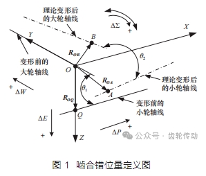 軸交錯點變形前為 O、Q,變形后為A、B 。齒輪軸線變形前用細實線表示,理論變形后用點劃線表示,ROA、ROB、ROQ 是點O 到 A、B、Q的向量。軸交錯點的偏移矢量為