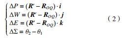 式中:?P為齒輪副沿小輪軸向的相對位移量;?W 為沿大輪軸向的相對位移量;?E為沿偏置方向的相對位移量;?Σ為沿軸交角方向的相對變化量;i、j、k為初始坐標系中坐標軸的單位矢量;θ1、θ2 為變形前后的軸交角。