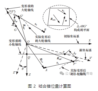 P、G 是變形前小、大齒輪齒寬中點在齒輪軸線上的投影點。受載變形后點 P、G 變成了點P ′、G ′ ,δP、δW分別是點 P到P ′ 以及G 到 G ′ 的距離。實際變形后軸線變成曲線用點劃線表示,在點P ′、G ′處分別作兩條曲線的切線,其方向向量為s1 和 s2。則兩個 方向向量的法矢 n 為