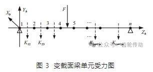 傳動軸的受載變形是導致齒輪副嚙合錯位的主要影響因素,因此準確計算傳動軸的變形量至關重要。傳動軸大多簡化為梁單元模型,其變形分析原理如圖 3 所示。