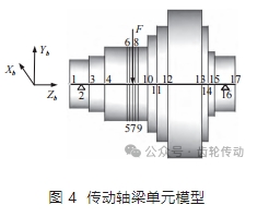 以某個復雜傳動軸為例,首先根據傳動軸的軸段數量來確定梁單元的初始節點數目,然后以載荷施加位置、邊界條件及軸的變形提取位置進一步增加節點數量,最后通過這些節點去建立完整的梁單元模型如圖 4 所示。節點 2 和節點 16 是支撐位置。節點 5~節點 9 是位移變形量的提取位置,節點 7 為載荷施加位置,其余節點是軸段的分界位置。
