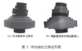 為了對比不同模型分析軸變形的誤差情況。同時按照圖 4 的結構去構建軸的實體有限元模型,其材料、受力情況以及邊界條件與梁單元模型的設置相同。通過靜力學分析得到兩種計算模型傳動軸的變形如圖 5 所示。