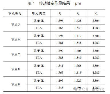 為了直觀地對比兩種模型的傳動軸變形情況,提取軸線上節點的變形量,見表 1。