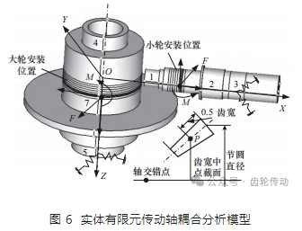 在小輪坐標系 ΣP中齒寬中點所在軸截面的導向點處施加嚙合力與彎矩;在大輪坐標系 Σqy 中齒寬中點所在軸截面的導向點處施加嚙合力與彎矩。