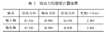 齒輪副的額定工作扭矩為 15 000 N·m,利用 3.2 節所述的計算公式得到嚙合力和彎矩計算結果,見表 3。