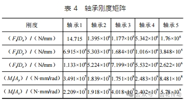 參考多支撐軸系中軸承單元剛度計算公式[11] 計算傳動系統中軸承剛度矩陣,導出各軸承剛度矩陣中在主對角元上的數值,見表 4。