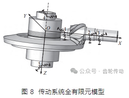 采用上述參數與傳動軸圖紙可以建立傳動軸耦合分析有限元模型,計算獲得傳動軸的變形量及齒輪副的嚙合錯位量。同時建立圖 8 所示的傳動系統全有限元模型與本文方法做對比分析。由于齒輪與傳動軸結合部位六面體網格劃分困難,因此輪齒部分采用四面體進行網格劃分。該模型中的材料屬性、傳動軸的設置方式與 3.1 節所述模型相同。齒面嚙合作用參考 3.3 節接觸對設置。添加邊界條件時,需注意在施加工作扭矩和轉角的參考點處約束自由度,除了軸線回轉自由度外,其余自由度將由軸承的等效彈簧約束。