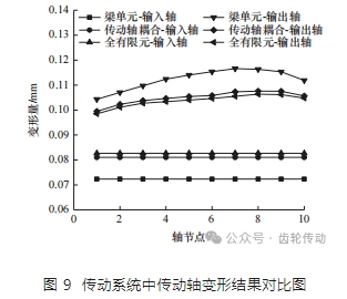 同時以梁單元構建傳動系統模型進行系統的嚙合錯位分析,分別提取三種模型傳動軸軸線上節點處的變形量。其中全有限元模型齒輪嚙合位置是時刻變化的,因此提取五齒模型中第三齒在節點嚙合時的變形量。最終繪制出傳動軸的變形結果,如圖 9 所示。