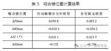 由表 5 可知,傳動軸耦合分析模型與全有限元模型的嚙合錯位量誤差在 2.5% 以內。