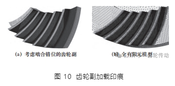 將每一嚙合瞬時的齒面接觸位置的應力提出疊加到齒面上可獲得齒面的加載接觸印痕,本文所述方法計算的加載印痕如圖 10a 所示,全有限元模型計算的加載印痕如圖 10b 所示,兩者的傳動誤差結果如圖 11 所示。