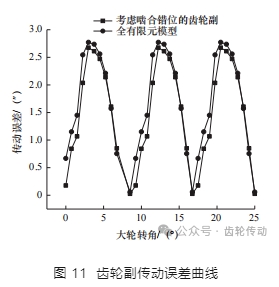 由圖 11 可知,分步螺旋錐齒輪傳動系統嚙合錯位分析方法得到的加載印痕與全有限元模型計算的加載印痕位置及形狀均一致,僅在齒寬方向有細微差異,其加載傳動誤差曲線形態吻合,幅值偏差在 1.3% 左右。