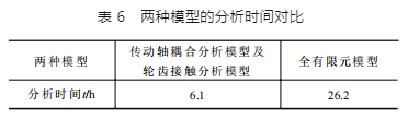 分步螺旋錐齒輪傳動系統嚙合錯位分析方法分為兩部分:傳動軸耦合變形分析模型部分的網格數約為 18.5 萬;考慮嚙合錯位的輪齒加載接觸分析模型網格數約為 80.4 萬(齒面接觸部分網格大小為 0.2 mm)。全有限元模型網格數量約為 308 萬(齒面接觸部分網格大小為 0.4 mm)。統計兩種分析模型的計算時間,見表 6。